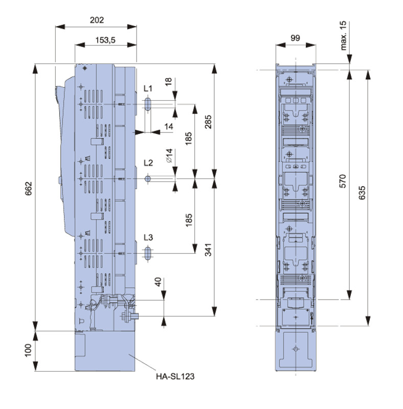 Tracon 500/690V AC, 220/400V DC, max.630A, 3P, 3 SL3-3X3/3A Függőleges biztosítós szakaszolókapcsoló, egyszerre nyitás 5997374184014